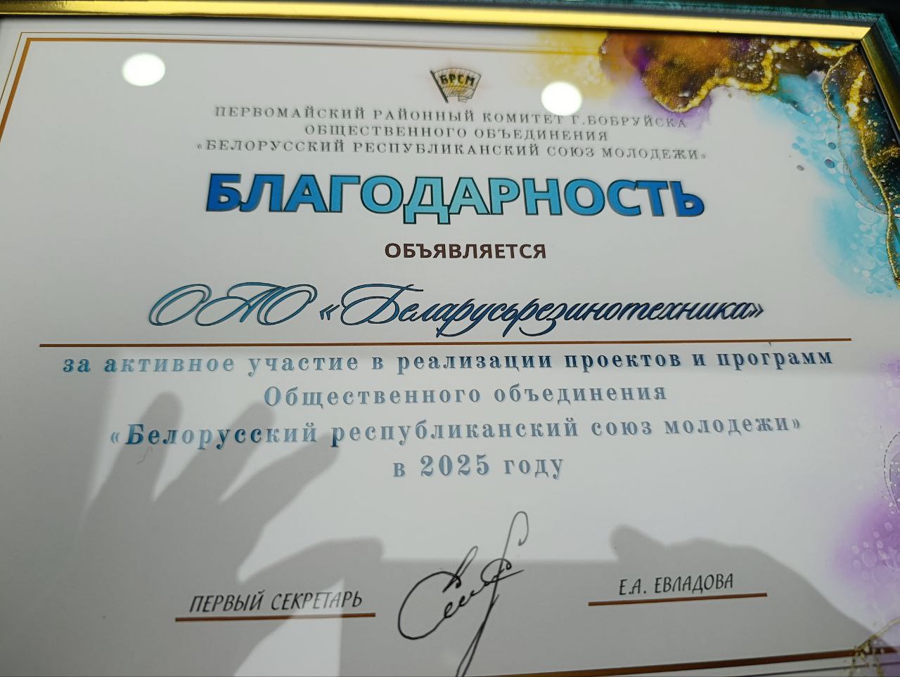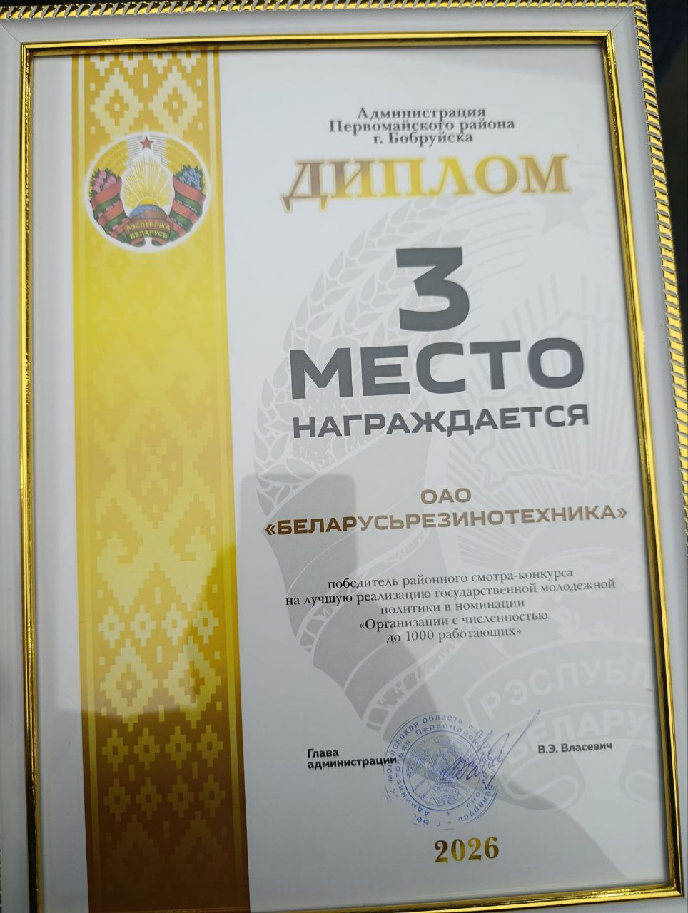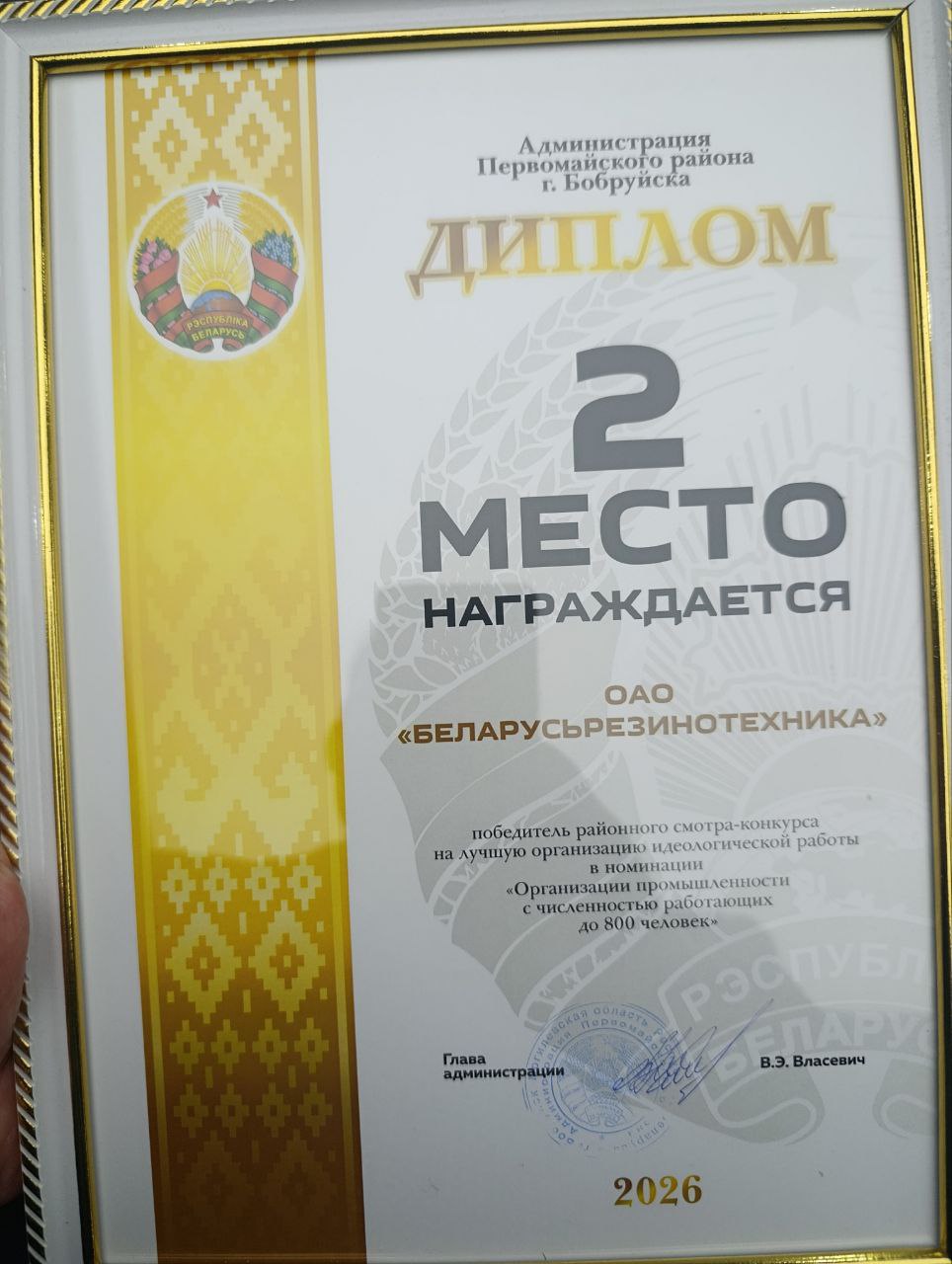 ОАО «Беларусьрезинотезника» заняло 2 место за лучшую организацию идеологической работы в номинации «Организации промышленности с численностью работающих до 800 человек», 3 место за лучшую организацию государственной молодежной политики и получило благодарность за активное участие в реализации проектов и программ ОО"Белорусский республиканский союз молодежи"!